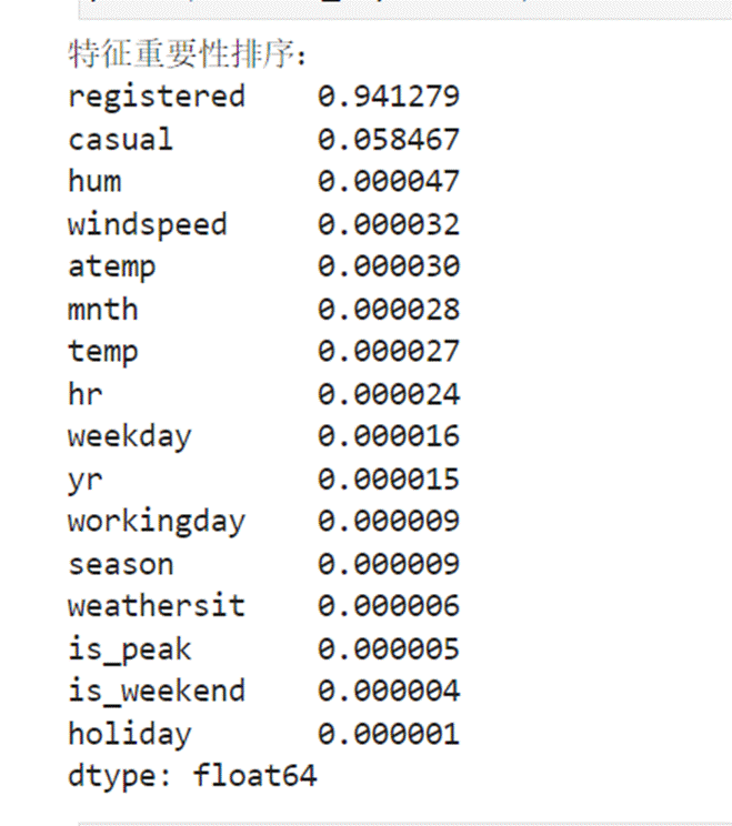 分析结果显示:小时(hr)、温度(temp)、是否工作日(workingday)是影响共享单车需求的核心特征,其中小时特征的重要性占比超过30%,这与实际业务中“早晚高峰需求高”的规律高度一致。