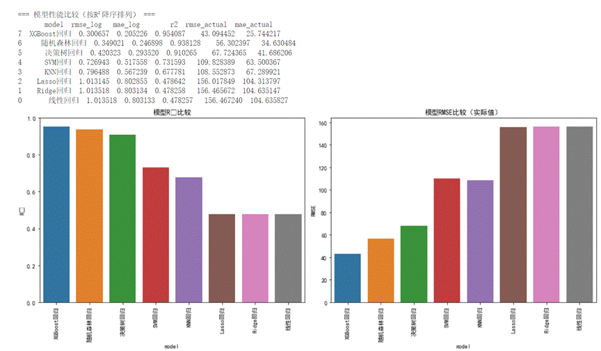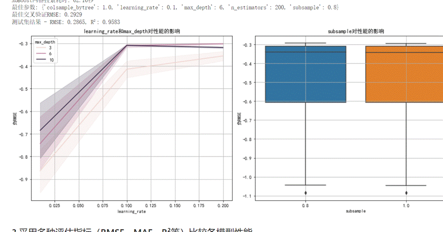 调优结果显示:随机森林的最优参数为n_estimators=200、max_depth=30,调优后测试集RMSE降至0.3184;XGBoost的最优参数为n_estimators=200、learning_rate=0.1、max_depth=6,调优后测试集RMSE降至0.2865,R²提升至0.9583,模型性能进一步优化。