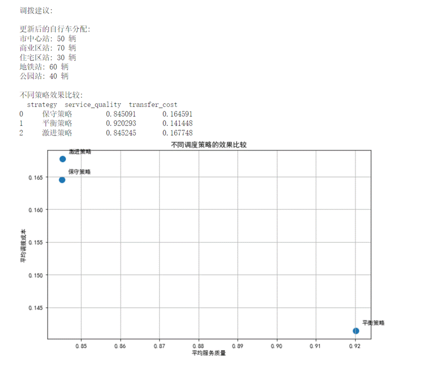 本研究对比了保守(服务水平0.8)、平衡(服务水平0.9)、激进(服务水平0.95)三类调度策略的效果,结果显示:平衡策略的平均服务质量达0.92,平均调拨成本为58元,在服务质量与运营成本之间实现了最优平衡。