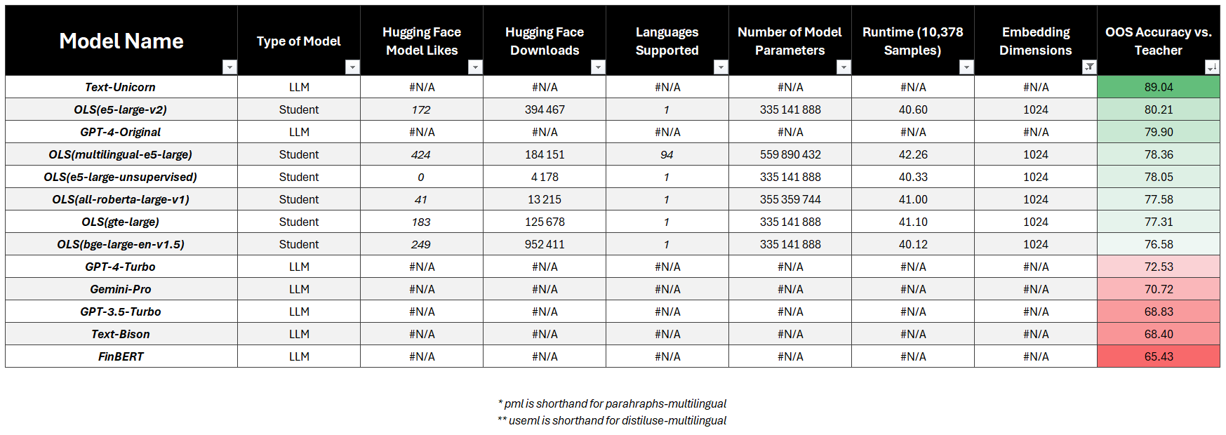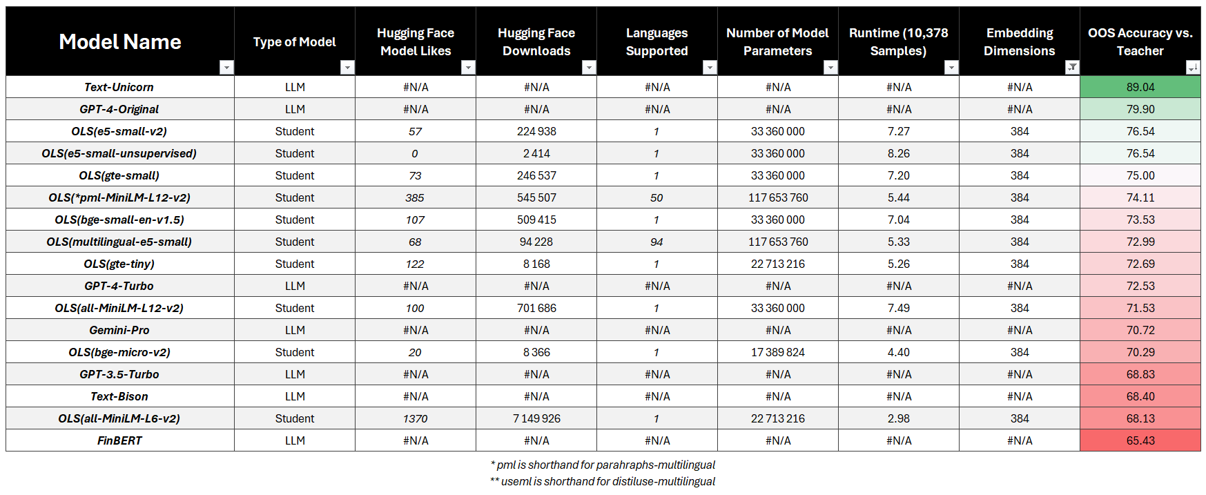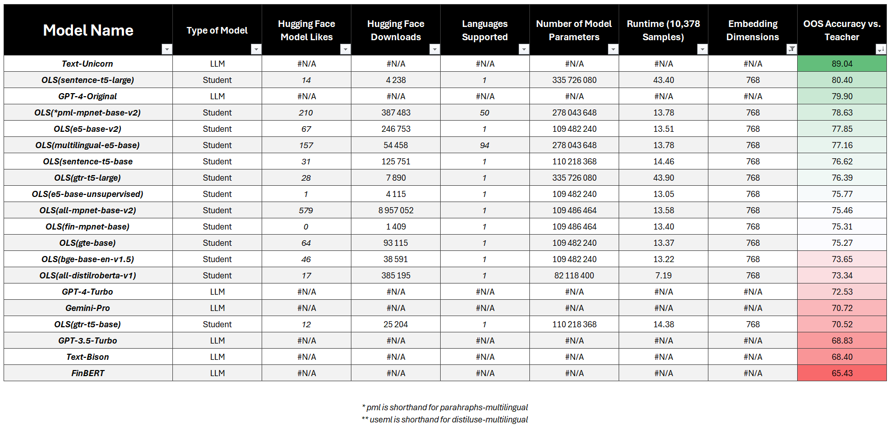 我们一共评测了38个模型,包括教师模型、主流LLM以及30个基于不同句子嵌入的轻量学生模型。整体结论非常明确:优质嵌入+简单回归,即可在金融情感任务上超过GPT-4。