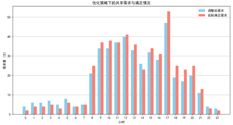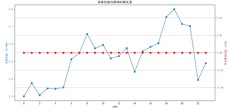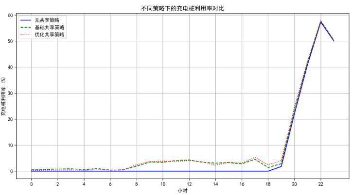 从图可见,无共享时日间利用率近乎为0,优化后(分时共享模型应用)上午9:00-12:00、下午17:00-18:00形成两个使用高峰,日均利用率从7.18%提升至9.17%(增幅27.7%),日间利用率从0.15%跃升至3.51%(增长超20倍),验证了模型对资源利用率的优化效果。