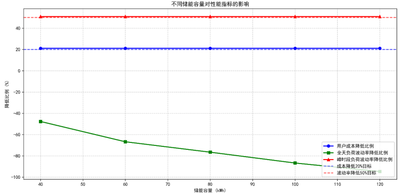 - 峰时段负荷波动率降低比例:稳定在51%左右,即使40kWh容量也能满足峰时波动控制目标(≥50%)。