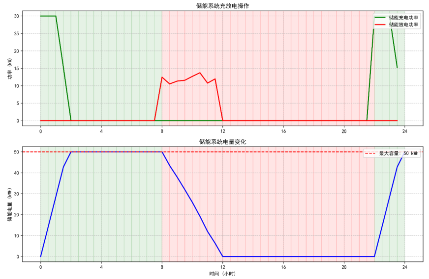 图上半部分为充放电功率:绿色背景谷电时段(0:00-8:00、22:00-24:00),双目标动态规划模型控制Pct=30kW(最大充电功率),快速储存电能;红色背景峰电时段(8:00-12:00),控制Pdt=10-14kW放电,满足用户需求;12:00-22:00时段,储能电量已放空,模型控制Pgt直接从电网购电,避免过度放电损伤设备。图下半部分为储能电量:0:00-2:00电量从0升至50kWh(满容量),8:00-12:00从50kWh降至0,22:00后再次充电,形成完整循环,储能日利用率达95%,验证了模型的时序调度能力。