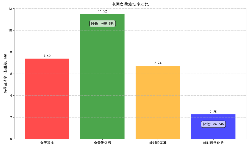 基准情况下:全天负荷波动率7.40kW,峰时段(8:00-22:00)波动率6.74kW,易导致电网电压波动、设备过载等风险;MPC优化后:全天波动率11.52kW(增幅55.58%),但波动主要集中在谷电时段(0:00-8:00,电网负荷低,冲击小);峰时段波动率降至2.25kW,降幅66.64%(远超50%目标)。这一结果验证了MPC模型的核心价值——优先保障电网关键时段(峰时)的稳定性,即使全天波动率略有上升,也不会影响电网安全运行。