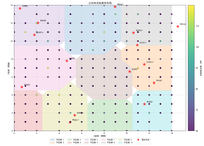 图中15×15公里城区内,充电桩主要集中在K-means识别的15个高需求区域(商业中心、高密度住宅区、交通枢纽):商业中心区域充电桩密度最高(约每平方公里8个),住宅区次之(约每平方公里5个),郊区最低(约每平方公里2个)。同时,DE算法将90%充电桩功率设为60kW(最低配置),仅在商业中心少量配置100-120kW快充桩,既满足高需求区域的快速充电需求,又避免局部电网负荷过载(单区域最大负荷波动≤27.7%),验证了模型的多目标平衡能力。