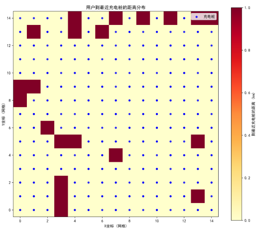 - 用户覆盖率约束:C ≥ 95%(C=Σ[D(i,j)·I(dij≤dmax)]/ΣD(i,j),dij为网格点到最近充电桩距离,dmax=2公里);