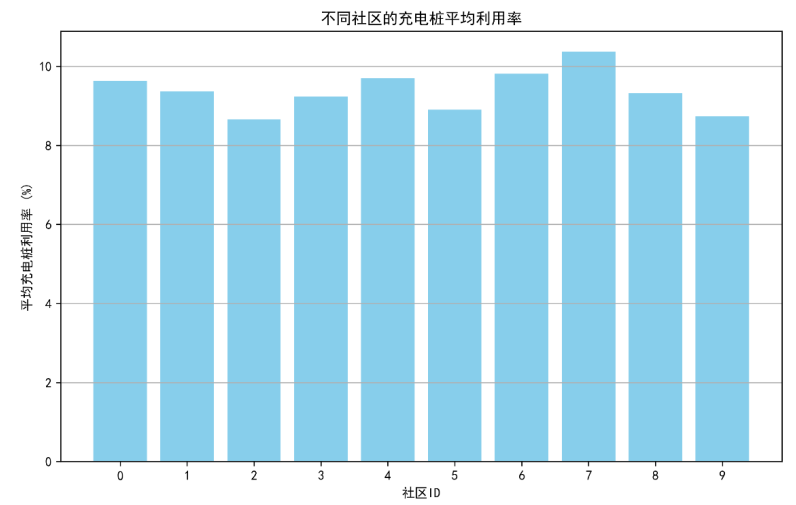 图中10个聚类区域对应社区内不同小区,颜色从深紫色(低利用率)到浅绿色(高利用率)渐变,多数充电桩利用率集中在10%-20%,仅少数达22.5%。这一分布特征表明,单纯统一共享策略无法最大化资源价值——对利用率低的区域(如社区边缘区域),可通过“共享首单立减”吸引用户;对利用率高的区域(如社区中心),需增加预约优先级规则,避免共享用户挤占车主自用需求,进一步验证了分时共享模型需结合空间特征优化的必要性。