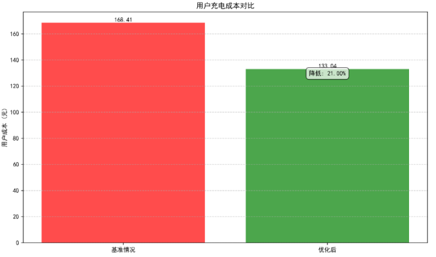 基准情况下(无储能):用户单次充电总成本168.41元(全部从电网购电,峰时电量占比60%);双目标动态规划模型优化后:成本降至133.04元,降幅21%(超20%目标)。成本降低源于两方面: