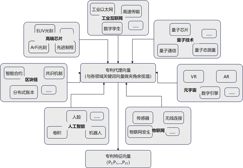 研究采用2009-2023年国家知识产权局通过形式审查的中国发明专利数据,参照《关键数字技术专利分类体系(2023)》,以专利主IPC分类号为匹配依据,筛选出人工智能、高端芯片、量子信息、物联网、区块链、工业互联网、元宇宙七大领域的专利,剔除交叉分类专利后得到67273条有效数据,将每条专利的标题与摘要文本合并,作为后续语义分析的基础数据。