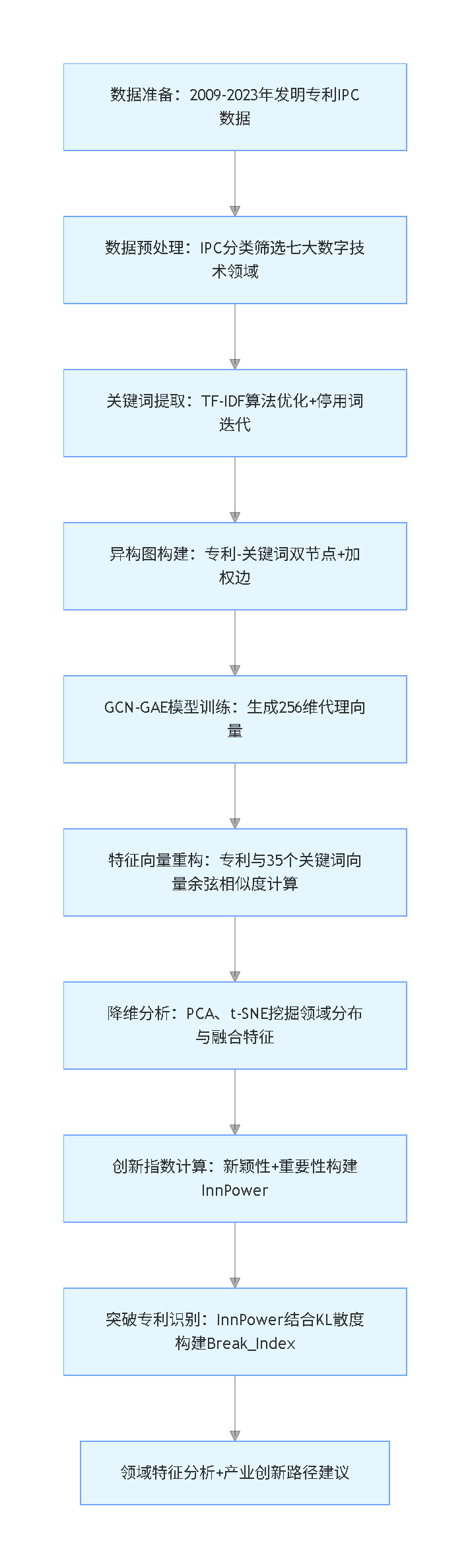 作为数据分析师,我们在为企业提供数字技术创新监测的咨询项目中,针对传统方法的痛点,构建了一套融合语义分析与图神经网络的专利分析框架。本专题正是基于该项目的技术沉淀打造,以2009-2023年中国发明专利数据为基础,围绕人工智能、高端芯片等七大数字技术领域,通过TF-IDF提取领域核心关键词,构建GCN-GAE专利-关键词异构图模型生成特征向量,结合PCA、t-SNE降维可视化与KL散度量化新颖性,实现了数字技术创新突破专利的精准识别与领域特征分析,该框架已在实际业务中得到校验,具备较强的落地性。