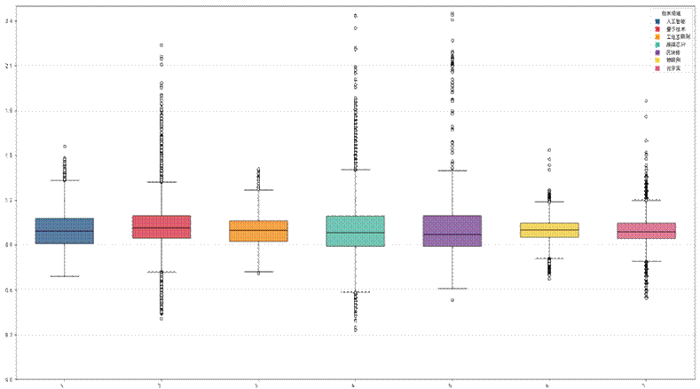 3. 技术成熟,创新活力不足领域:人工智能、物联网、工业互联网。人工智能专利数量10705条,均值1.001,标准差0.128,箱线图分布集中,离群点少,说明该领域已进入技术成熟期,创新以边际优化为主,颠覆性突破减少;物联网和工业互联网的均值分别为0.994和0.995,标准差均小于0.1,箱线图箱体紧凑、几乎无离群点,说明这两个领域的技术路径趋于收敛,标准化程度高,创新以应用场景优化为主,缺乏突破性进展。