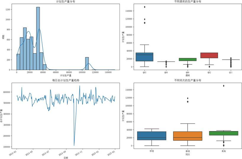 在建模之前,我们对数据进行了严格的质量检查。发现“班次”字段存在625条缺失值,我们将其统一填充为“未知”,以保持数据的完整性。对于其他异常值,我们通过后续的统计描述进行识别和评估。下图直观地展示了计划生产量的分布特征,我们发现产量分布呈现右偏,存在极端高值,且不同酒质(如Q03、Q06)和不同班次(早班、中班)之间的产量存在显著差异。