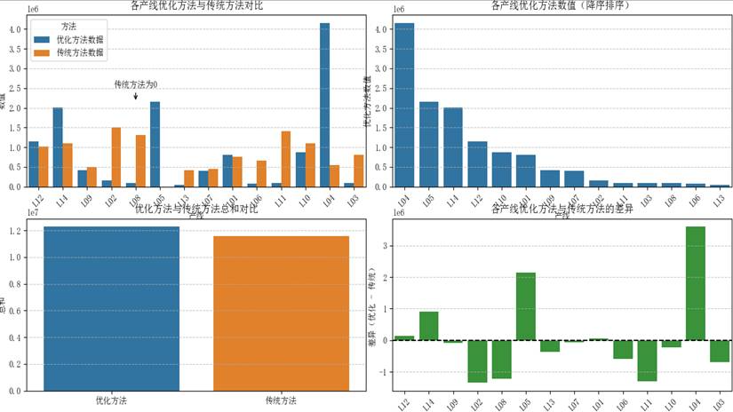 解读:优化方法在绝大多数生产线上都取得了更好的产量表现。以L05为例,传统方法完全没有安排生产,而优化方法将其充分利用,产量超过215万。这说明我们的模型能够更有效地识别和利用产能资源。
