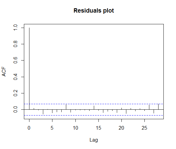 系数给出了标准误差,这需要在可接受的范围内。Akaike信息标准(AIC)评分是ARIMA模型准确性的良好指标。模型更好地降低AIC得分。我们还可以查看残差的ACF图; 良好的ARIMA模型的自相关性将低于阈值限制。预测的点收益为-0.001326978,在输出的最后一行中给出。