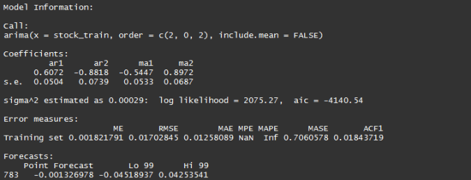 fit = arima(stock_train,order = c(2,0,2),include.mean = FALSE)