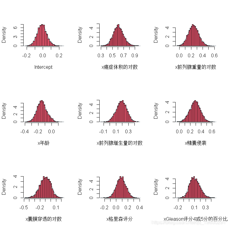 这些协变量是:癌症对数体积(lcavol)、前列腺的对数重量(lweight)、年龄(age)、良性前列腺的对数体积(lbph)、精囊侵犯(svi)、胶囊穿透的对数(lcp)、格里森评分(gleason)以及格里森评分4或5的百分比(pgg45)。