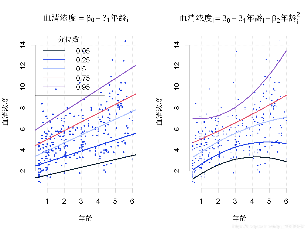 该图显示了298名6个月至6岁儿童的免疫球蛋白G的散点图。叠加在该图上的是{.05, .25, .50, .75, .95}的RQ线(左图)和 RQ线(左图)和RQ曲线(右图)。