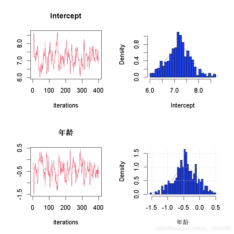 相应的吉布斯采样的收敛性是通过生成样本的路径图和边际后验直方图评估的。因此,图可以用来提供一个关于吉布斯采样器收敛的图形检查,通过使用以下代码检查路径图和边际后验直方图。