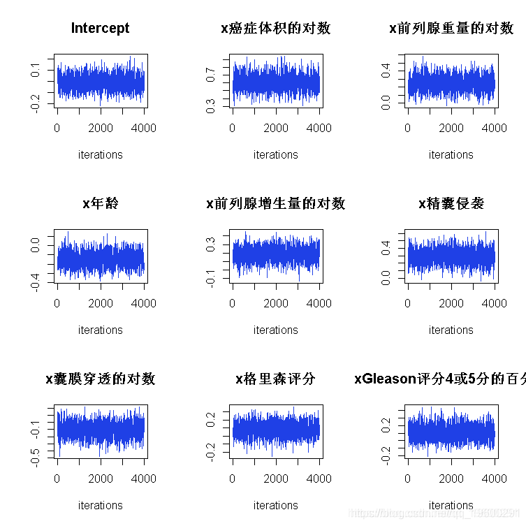在本小节中,我们假设因变量(lpsa)均值为零,而预测因子已被标准化,均值为零。为了说明问题,我们考虑当τ=0.50时,贝叶斯lasso套索RQ(方法=”BLqr”)。在这种情况下,我们使用以下代码