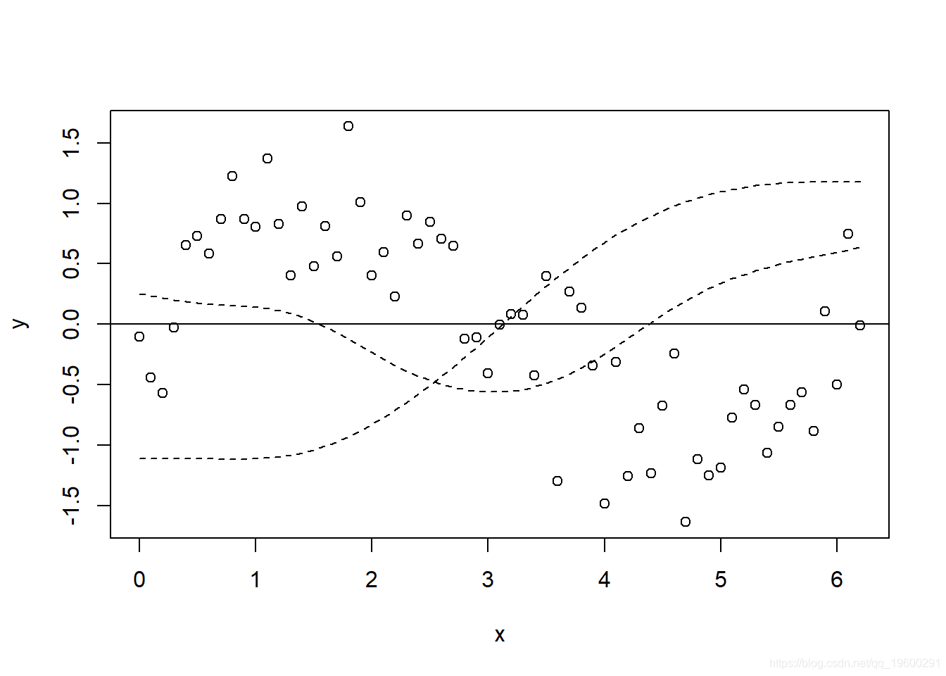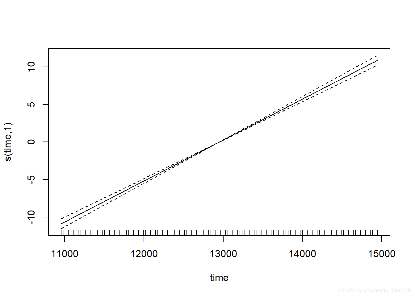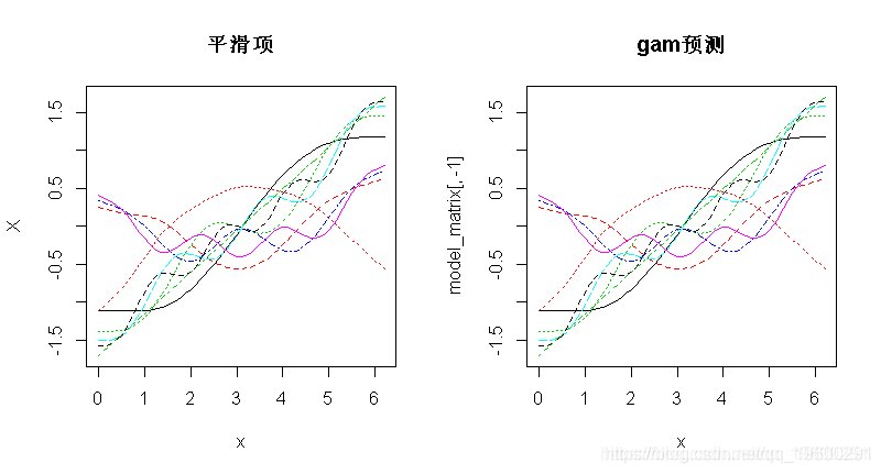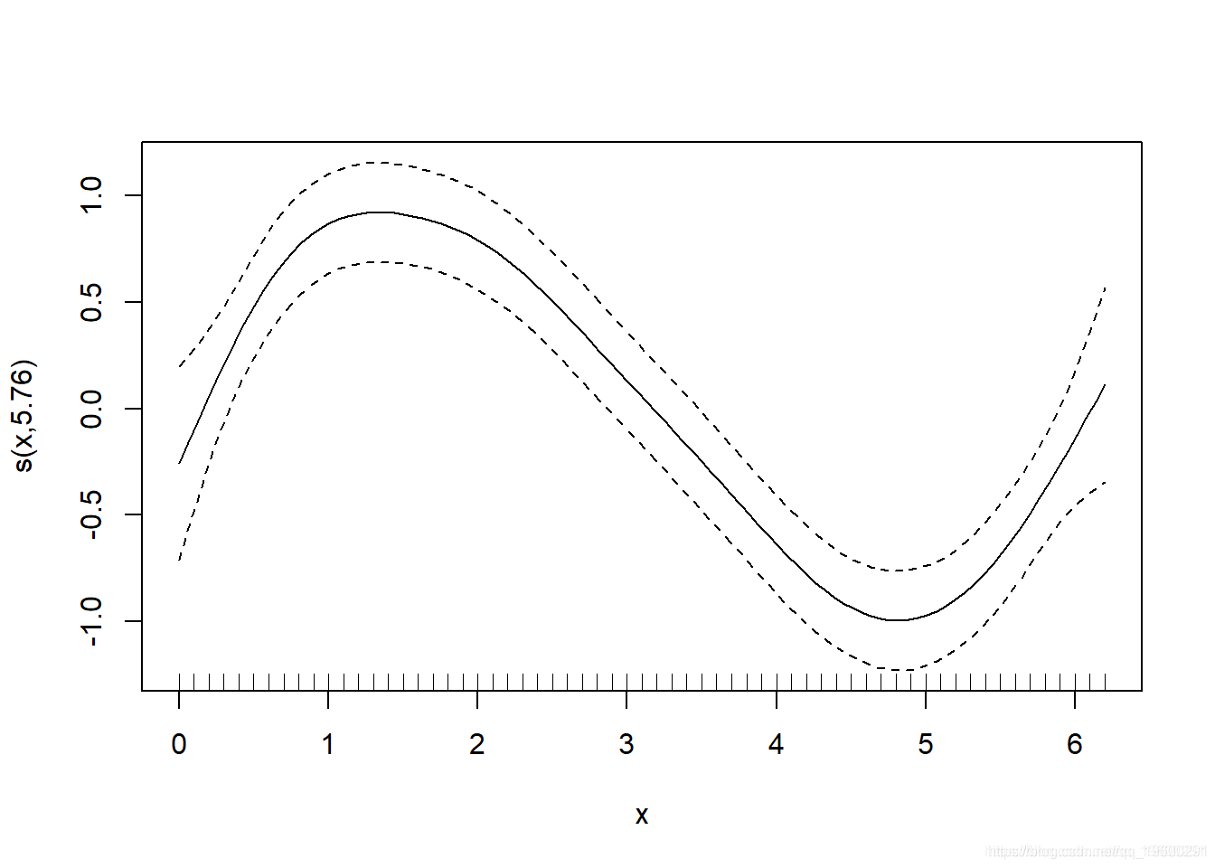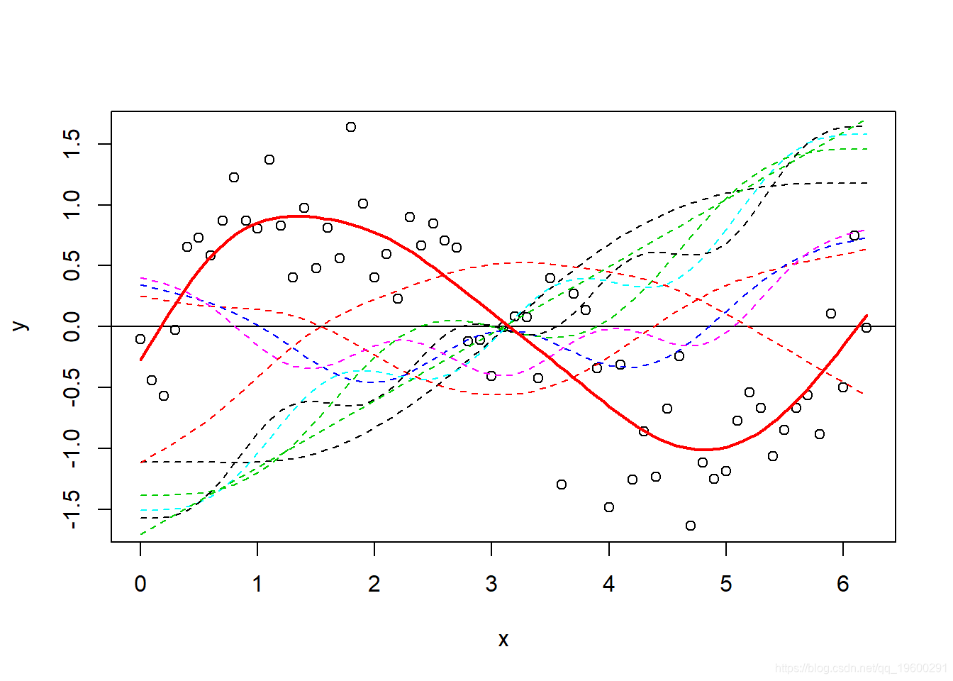 现在,最容易想到这样-每条虚线都代表一个函数(bj),据此 gam 估算系数(βj),将它们相加即可得出对应的f(x)的贡献(即先前的等式)。对于此示例而言,它很好且简单,因为我们仅根据光滑项对y进行建模,因此它是相当相关的。顺便说一句,您也可以只使用 plot.gam 绘制光滑项。