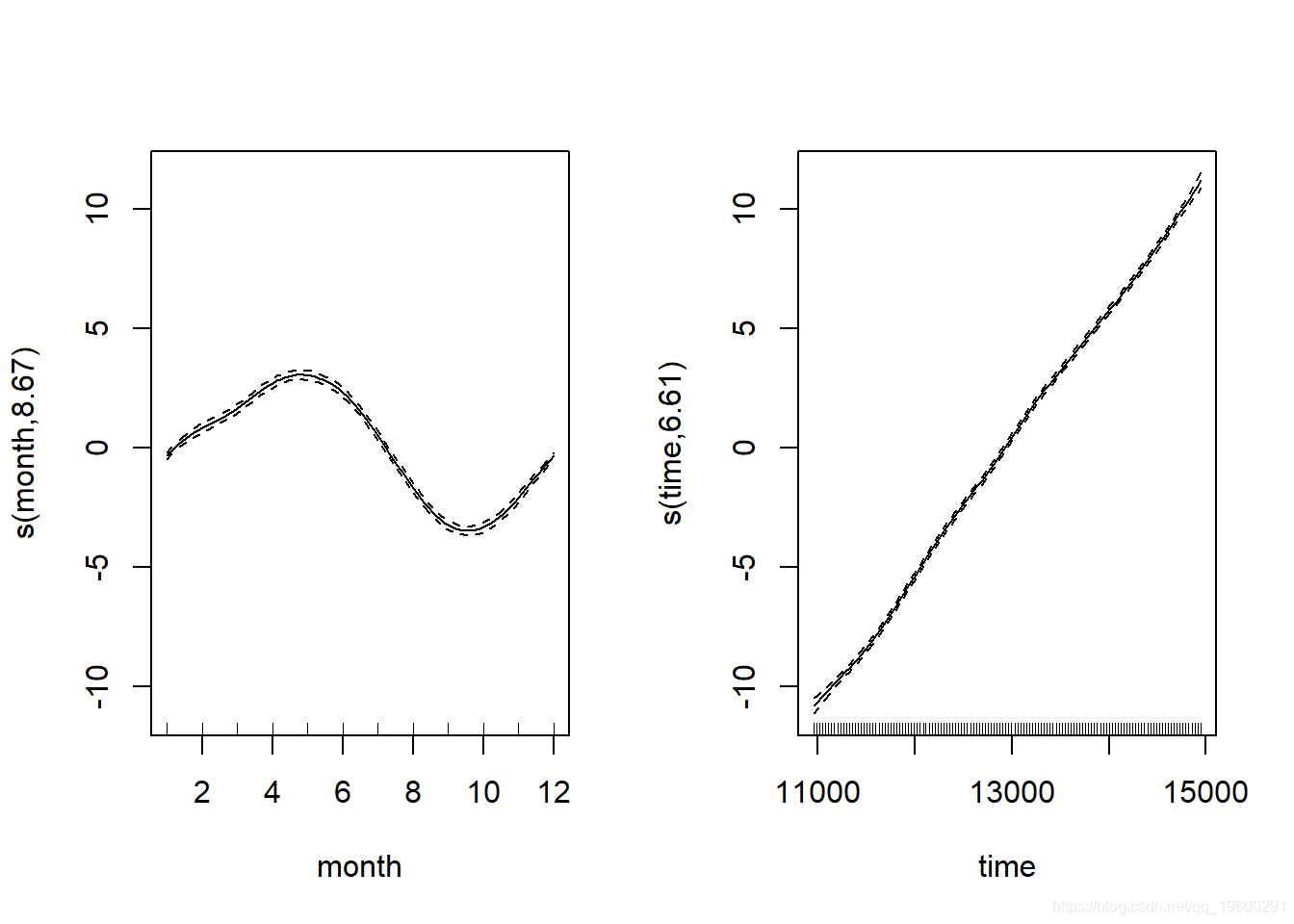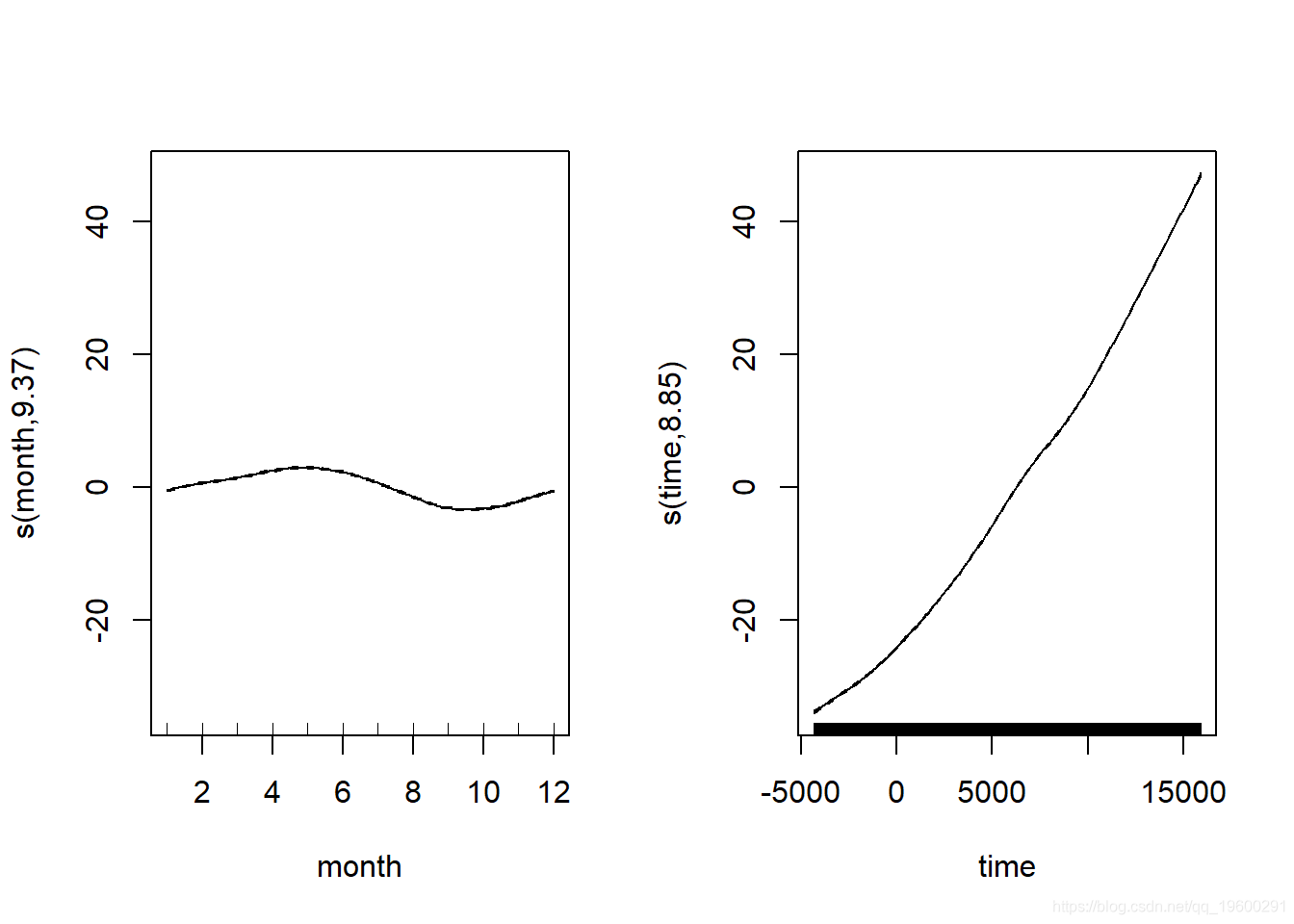 现在,我们将看到 bs = 用于选择光滑器类型的k = 参数和用于选择结数的 参数,因为三次回归样条曲线具有固定的结数。我们使用12结,因为有12个月。