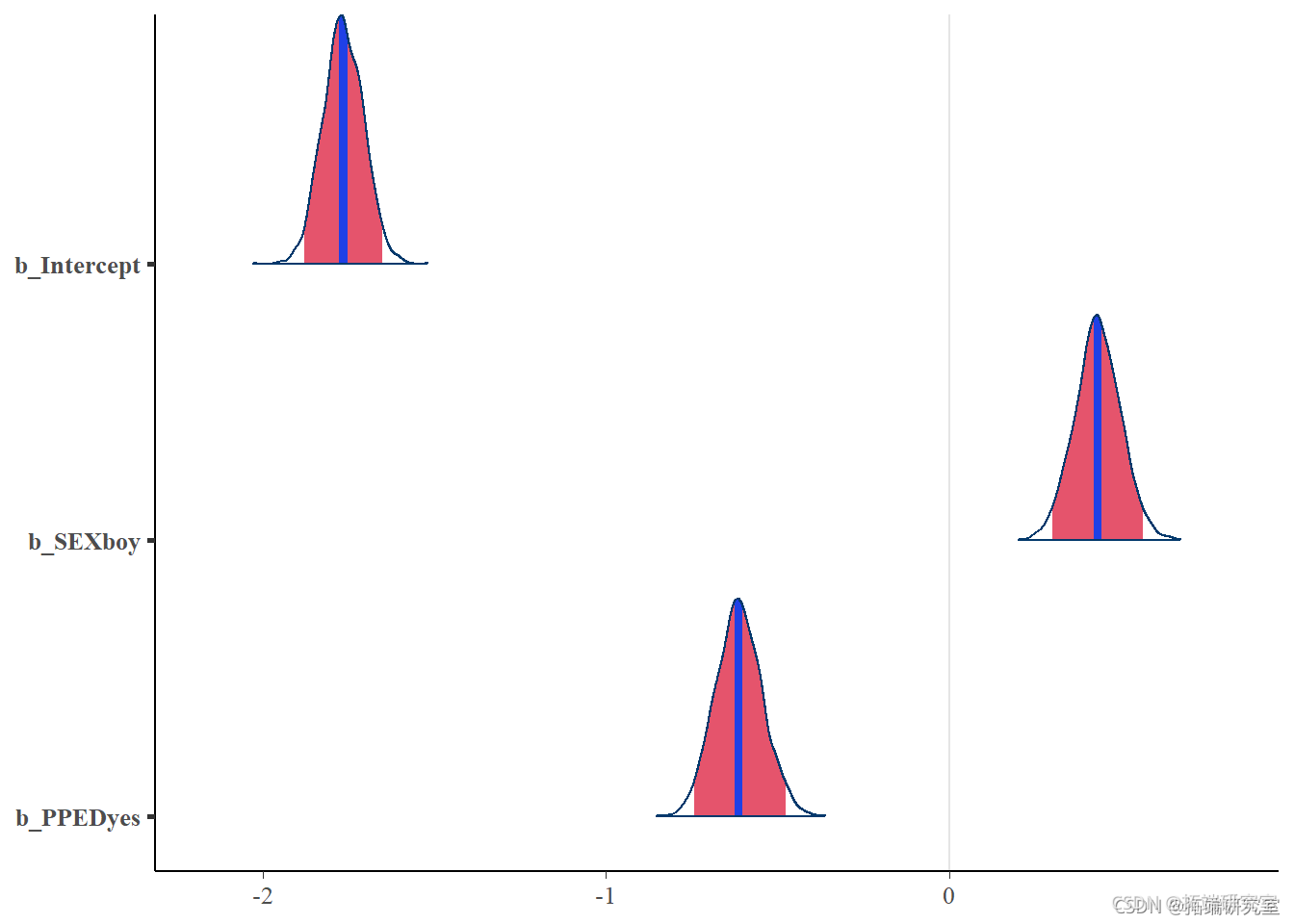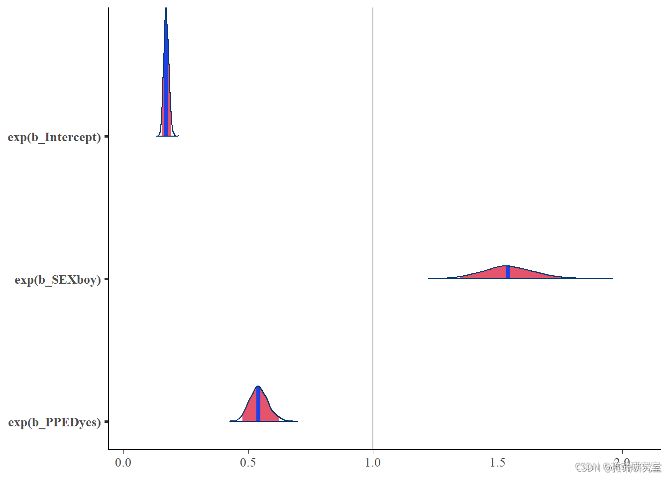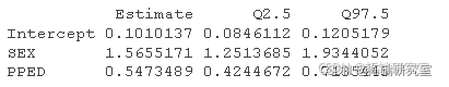 都是有意义的预测变量,因为它们的置信区间不包含零,并且它们的密度具有非常窄的形状。 SEX
