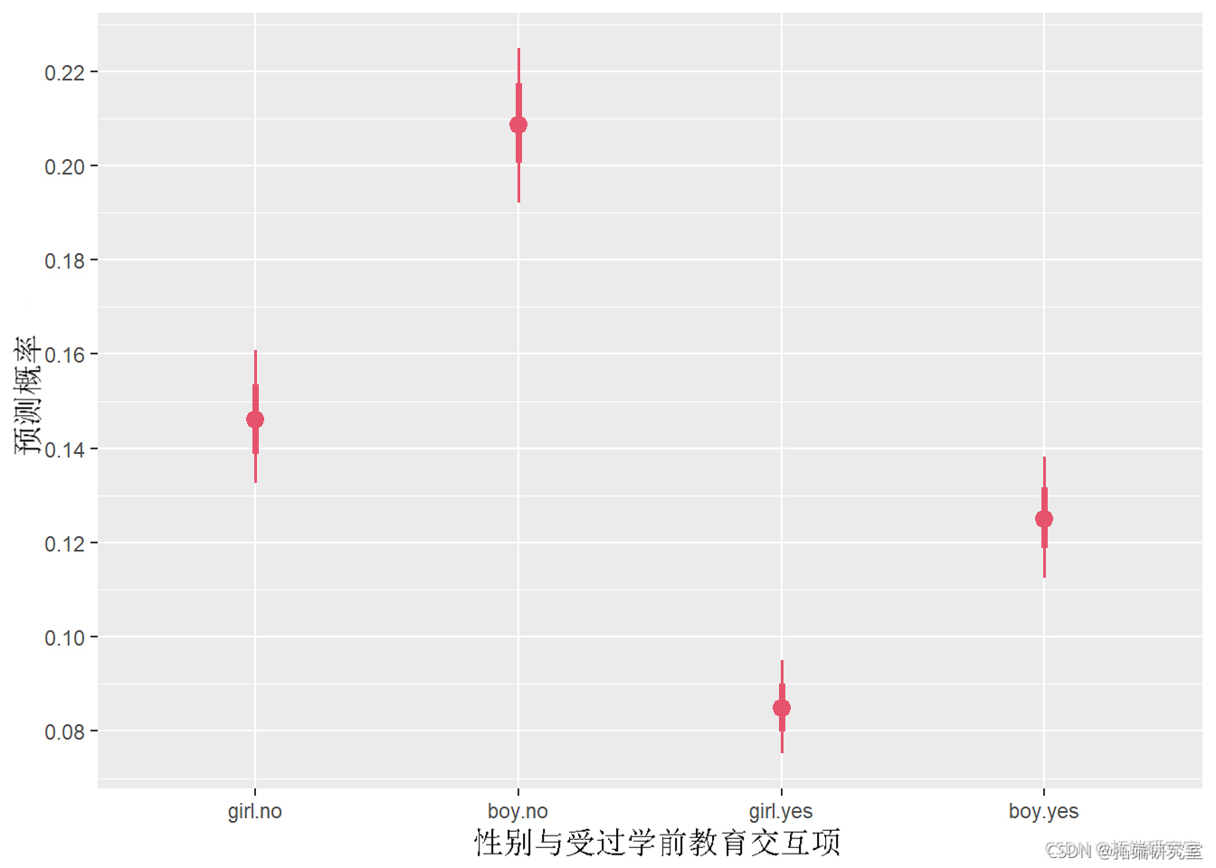 如我们所见,未受过学前教育的男生概率最高(~0.21),其次是未受过学前教育的女孩(~0.15),受过学前教育的男孩(~0.13),最后,是一个受过学前教育的女孩(~0.09)。请注意,估计值的 68%(较粗的内线)和 95%(较细的外线)置信区间都包括在内,以使我们对估计值的不确定性有所了解。