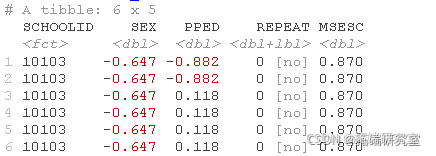 Ed\_e <- Ed\_Ra %>% mtae(SCHLI = fcor(SCLID, SEX = if_se(SX == 0, "grl", "by"), SEX = facor(SEX, lvls = c("gil", "boy")), PED = if_ese(PPED == 0, "no", "yes"), PED = facr(PPD, leel = c("no", "yes")))