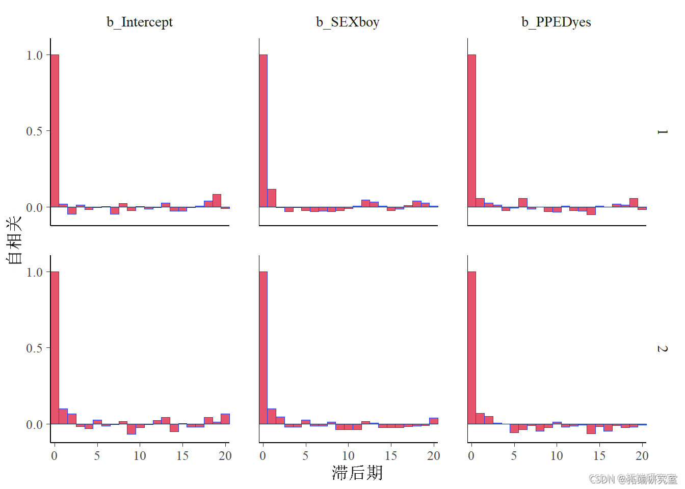 该图没有显示两个链中所有模型变量的自相关证据,因为自相关参数都迅速减小到零附近。