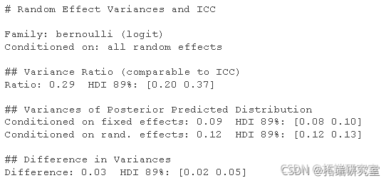 下面我们计算仅截距模型的 ICC(类内相关性)。请注意,对于非高斯贝叶斯模型(例如逻辑回归),我们需要设置“ppd = T”,以便方差计算基于后验预测分布。