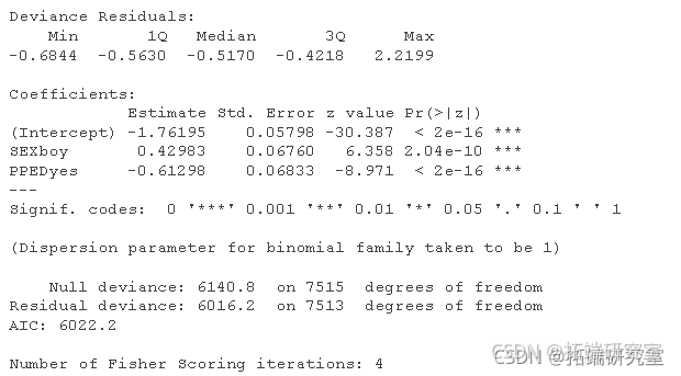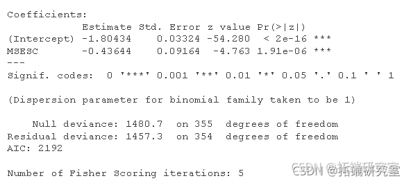 为了比较,下面是频率论二元逻辑回归模型的模型摘要。