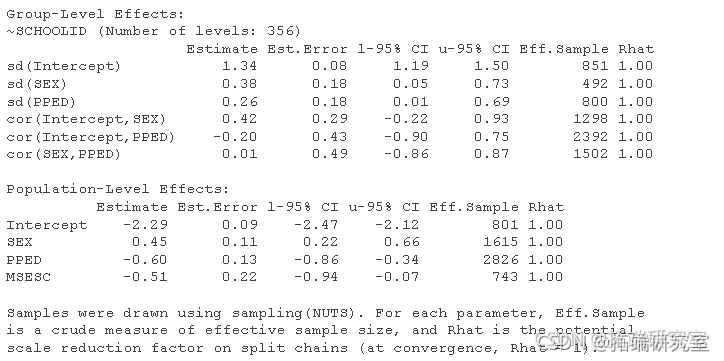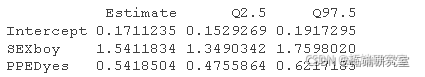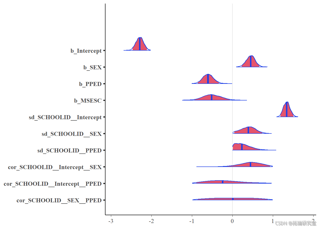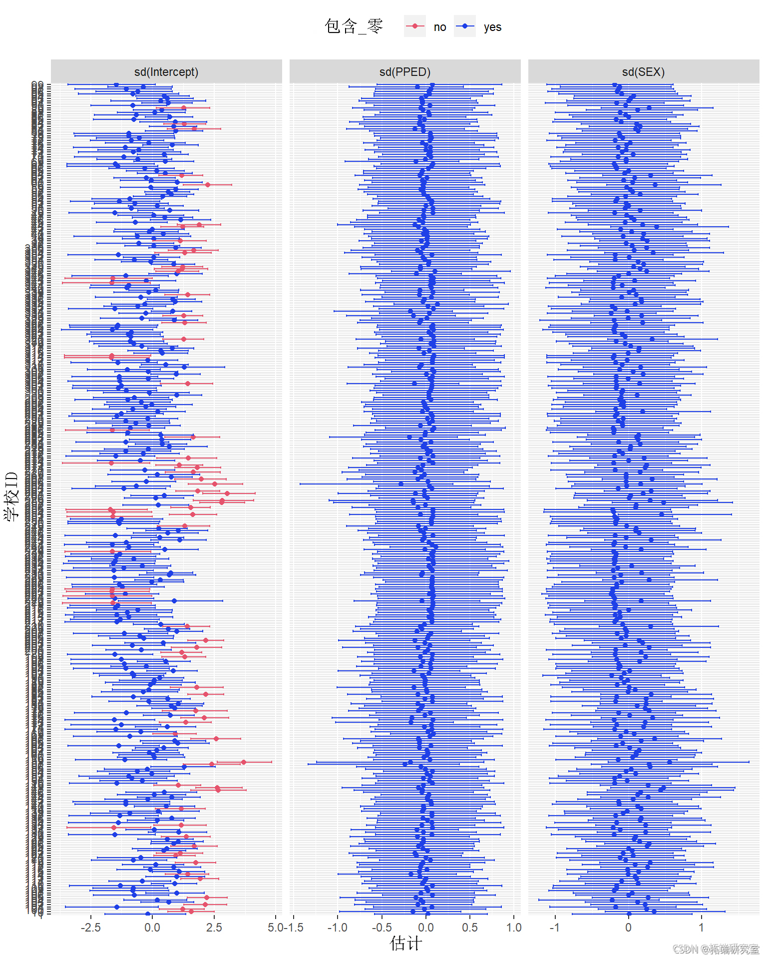 #提取所有随机效应项的后验分布 RdEffct <- rf(aoFl) #提取 "sd(Intecpt) "的后验分布 r_ec <- dRf$CI\[, , 1\] %>%。 abbe() %> roton(var = "ID") %>% uae(Vrible = "d(Inercpt)") #提取\`sd(SEX)\`的后验分布。 r_ <- dam$OD\[, , 2\] %>%>。 astle() %>%。 rnlmn(var = "ID") %>% mae(Vaiae = "sd(SEX)") #提取\`sd(PPED)\`的后验分布 r_ED <-atdSH, 3\] %>%>。 ate() %>%。 rotcnr = ID") %>% ute(Vaiale = "sdPE)") #绘图 r_ntct %>% bdows(r_EX) %>% biws(_PED) %>% mat(Coro= ifese(Q2.5*Q97.5 > 0, "no", "yes") ) %>% pot() + goint() + erbr(as(yin=Q2.5, ymx=Q97.5))