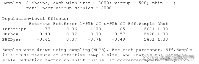 现在,我们可以进行模型的解释。下面是贝叶斯二元逻辑回归模型的模型摘要。