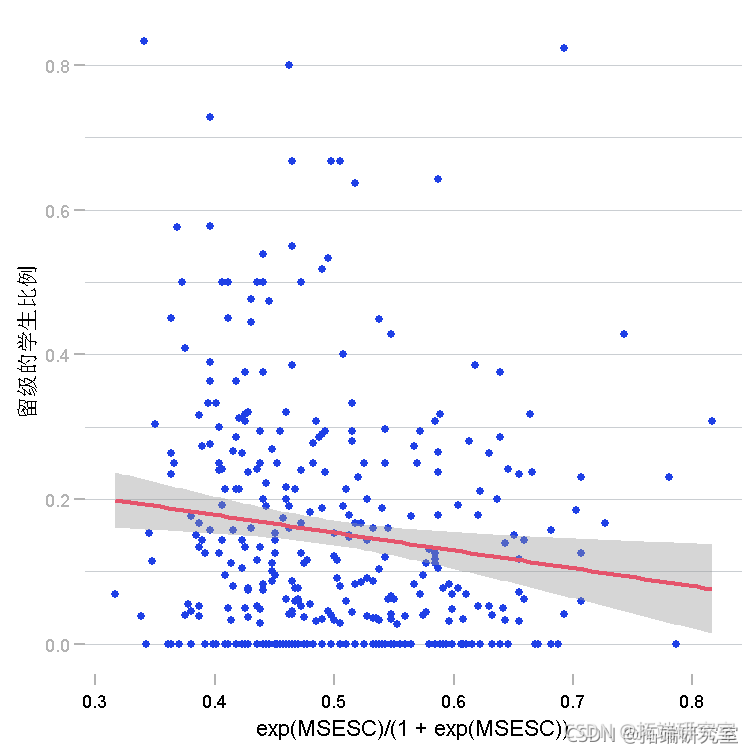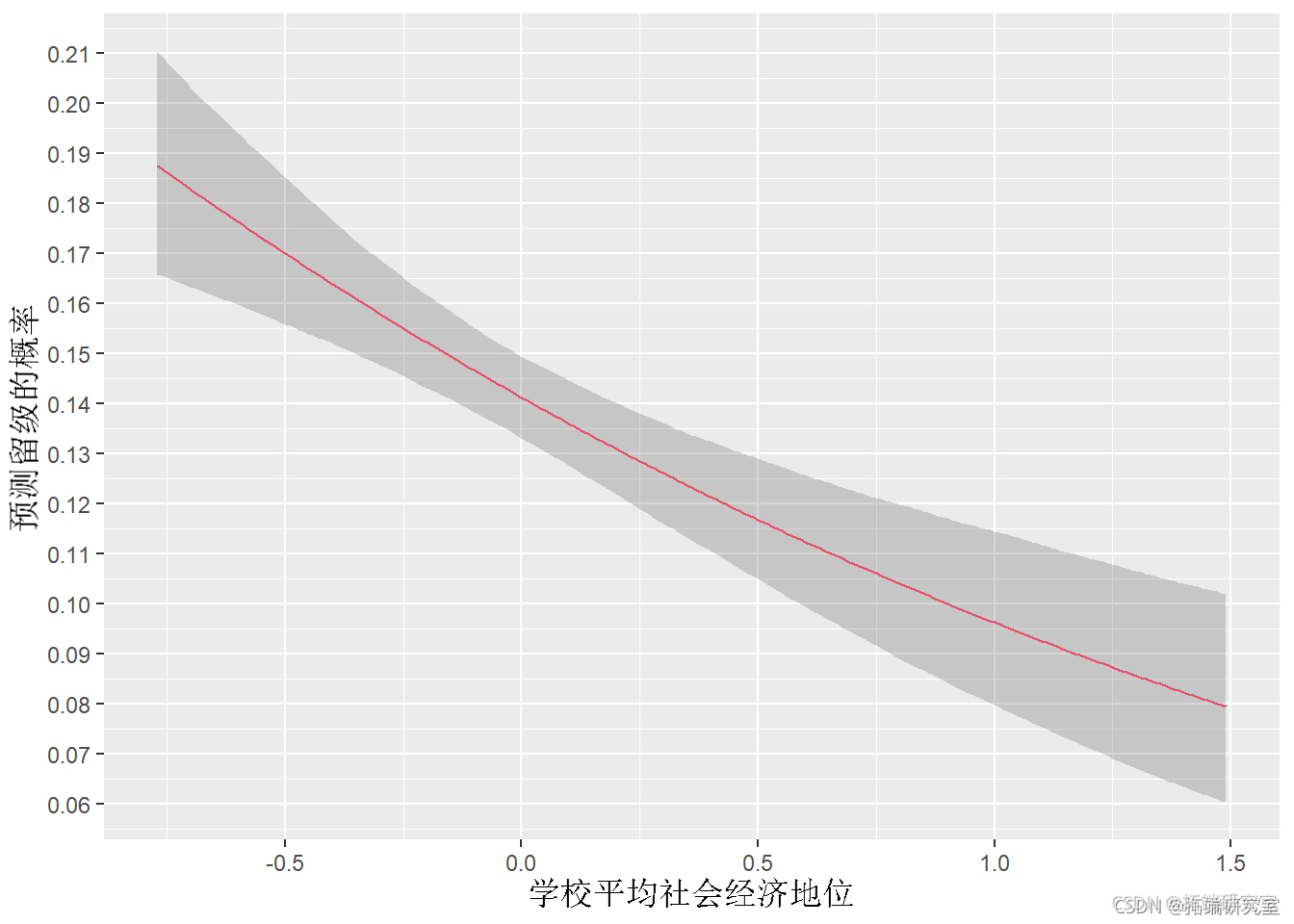增加,学生留级的概率降低(从 0.19 到 0.08)。灰色阴影区域表示每个 值处预测值的 95% 置信区间 MSESC