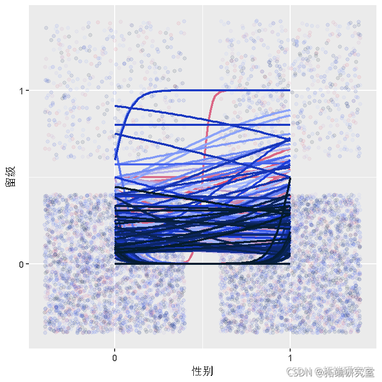 在上面的图中,不同的颜色代表不同的学校。我们可以看到,不同学校的SEX和REPEAT之间的关系似乎有很大不同。