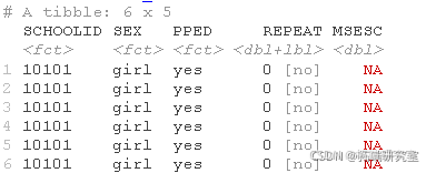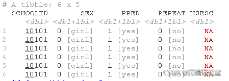 这些数据来自于全国性的小学教育调查。数据中的每一行都是指一个学生。结果变量REPEAT是一个二分变量,表示一个学生在小学教育期间是否留过级。SCHOOLID变量表示一个学生所在的学校。个人层面的预测因素包括。性别(0=女性,1=男性)和PPED(受过学前教育,0=没有,1=有)。学校层面的是MSESC,代表学校平均SES(社会经济地位)得分。