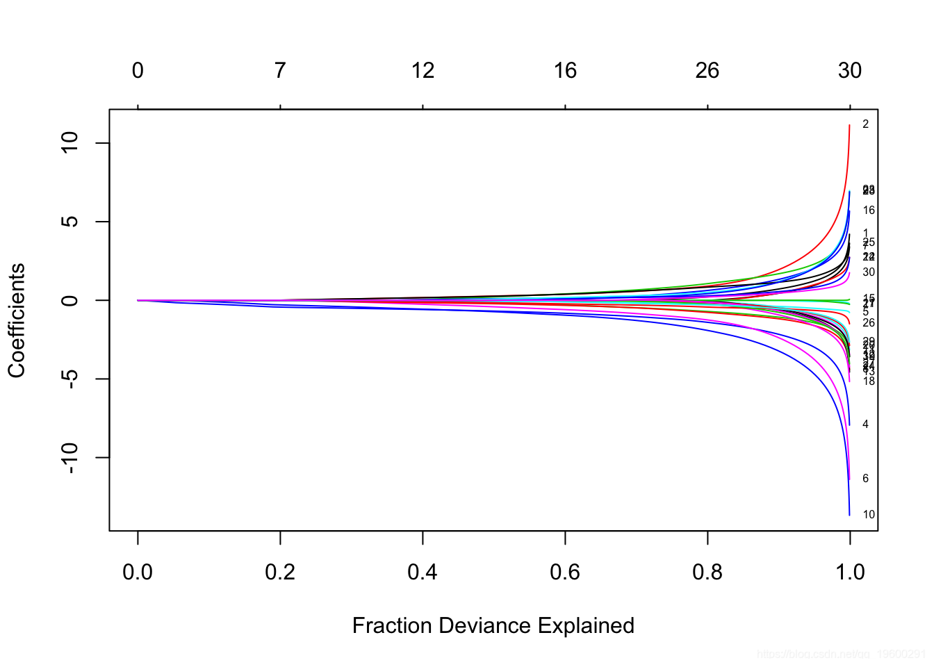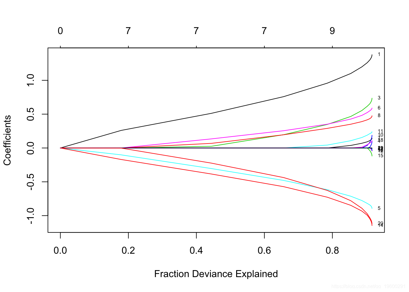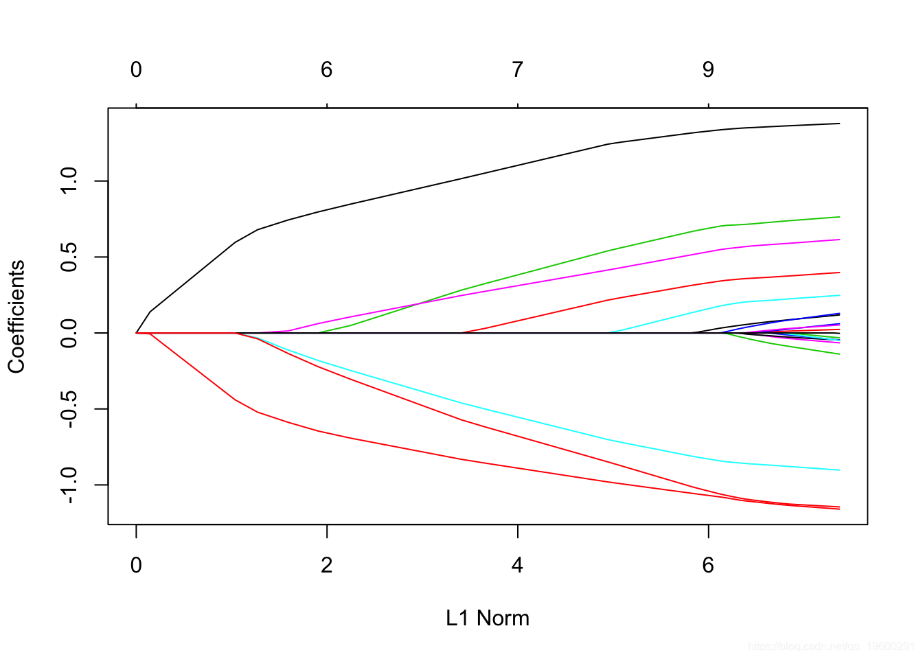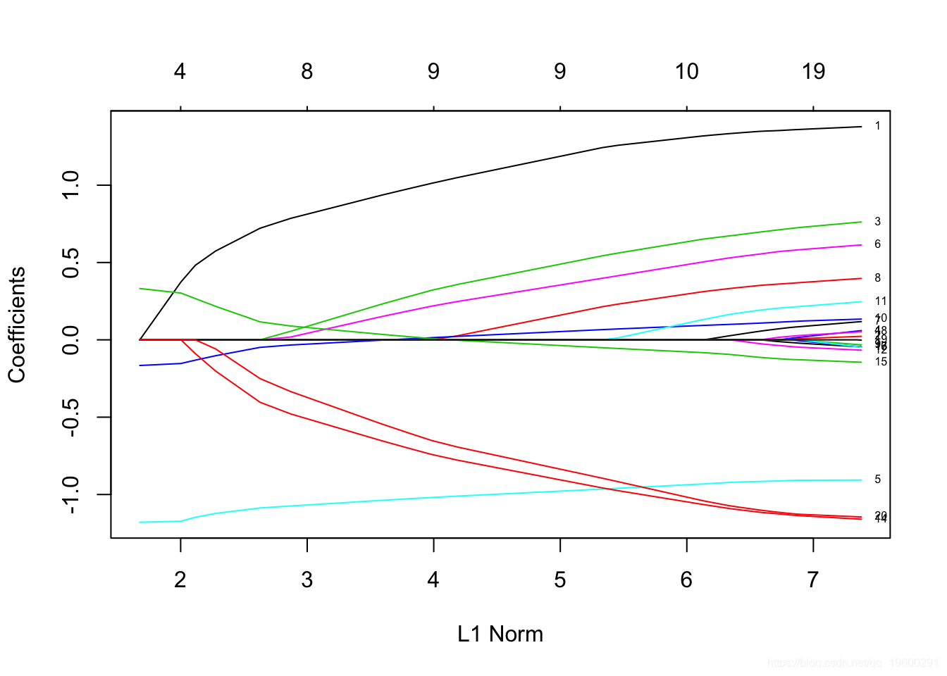 每条曲线对应一个变量。它显示了当λ变化时,其系数相对于整个系数向量的ℓ1范数的路径。上方的轴表示当前λ处非零系数的数量,这是套索的有效自由度(df)。用户可能还希望对曲线进行注释。这可以通过label = TRUE 在plot命令中进行设置来完成 。
