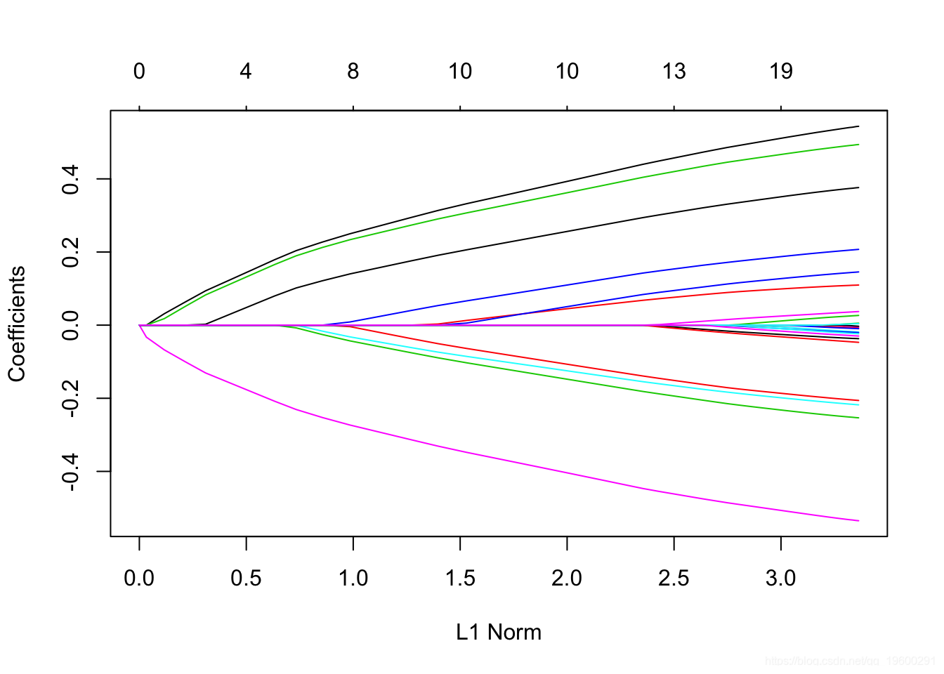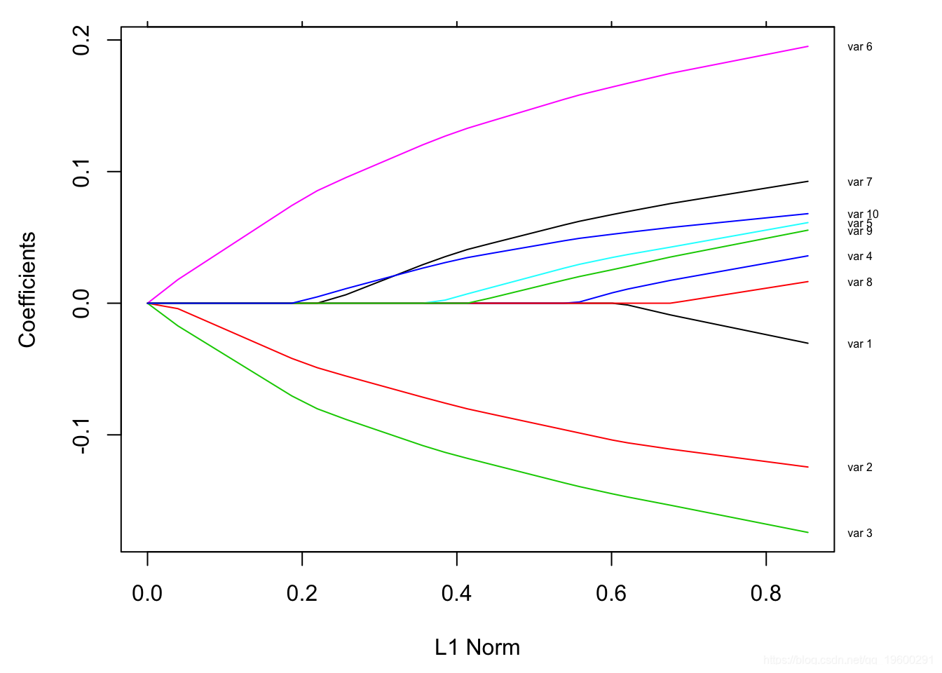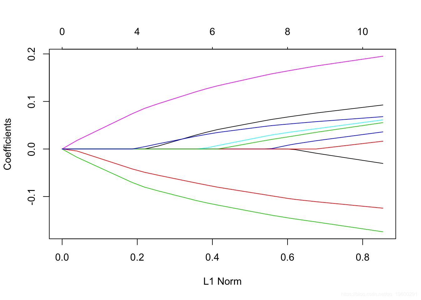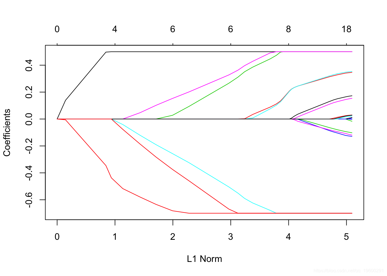 每条曲线对应一个变量。它显示了当λ变化时,其系数相对于整个系数向量的ℓ1范数的路径。上方的轴表示当前λ处非零系数的数量,这是套索的有效自由度(df)。用户可能还希望对曲线进行注释。这可以通过label = TRUE 在plot命令中进行设置来完成 。