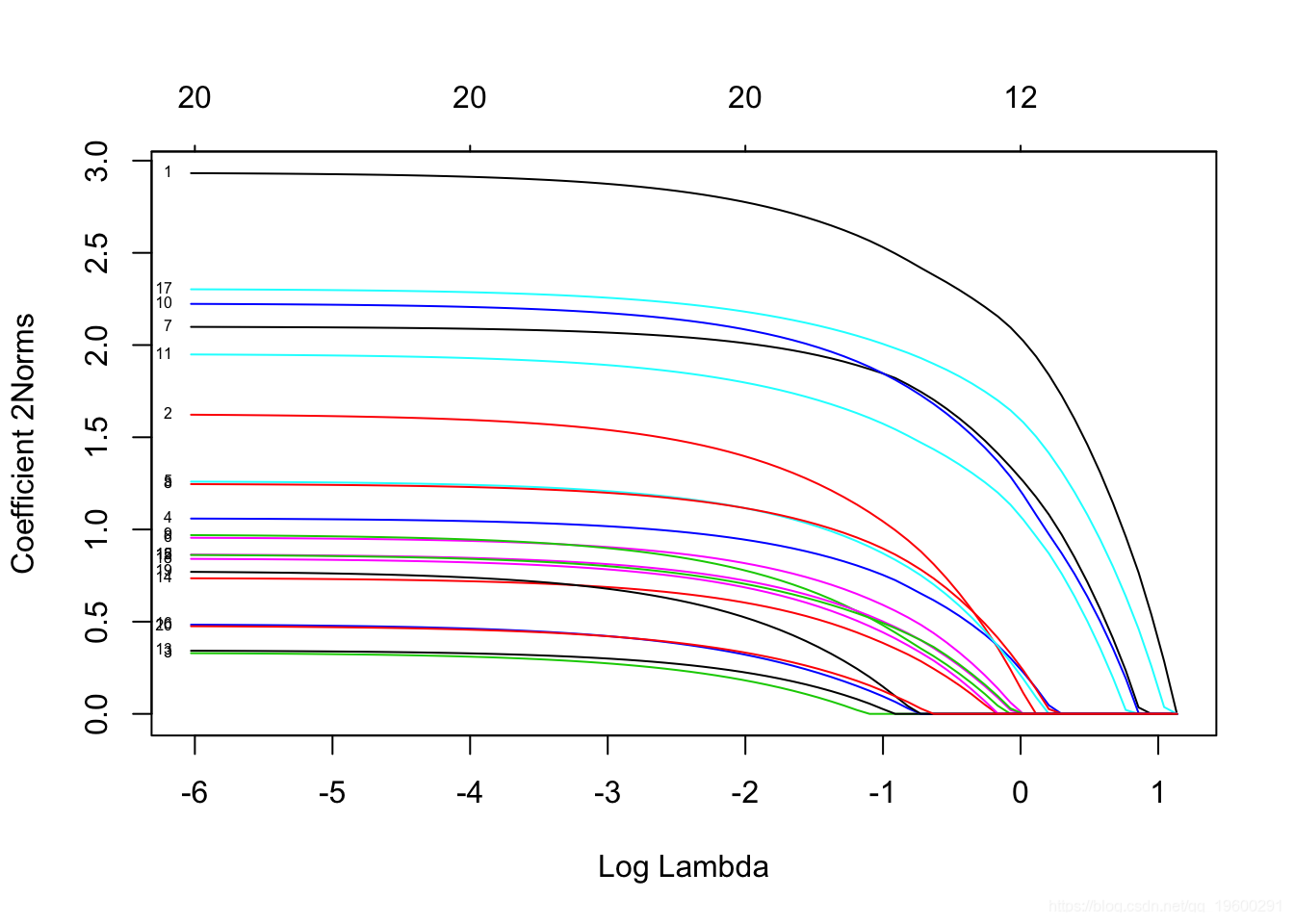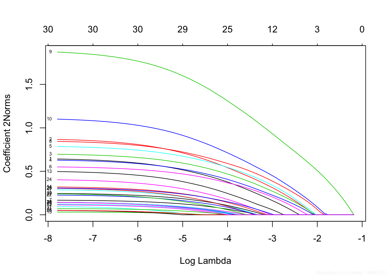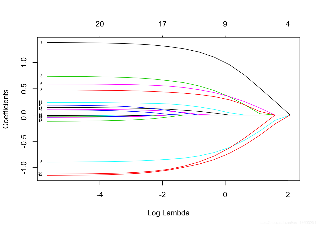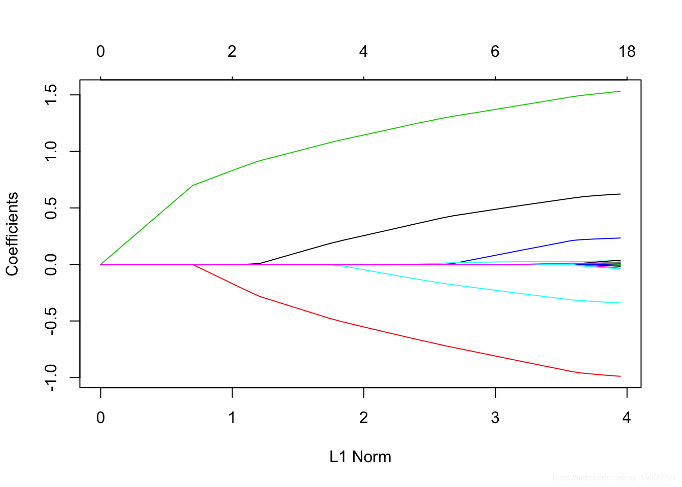 每条曲线对应一个变量。它显示了当λ变化时,其系数相对于整个系数向量的ℓ1范数的路径。上方的轴表示当前λ处非零系数的数量,这是套索的有效自由度(df)。用户可能还希望对曲线进行注释。这可以通过label = TRUE 在plot命令中进行设置来完成 。