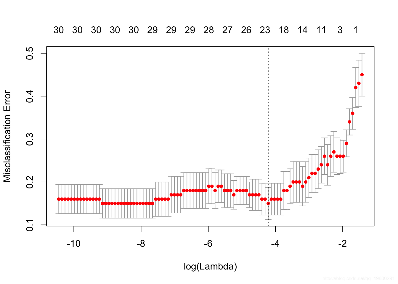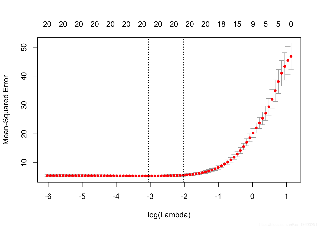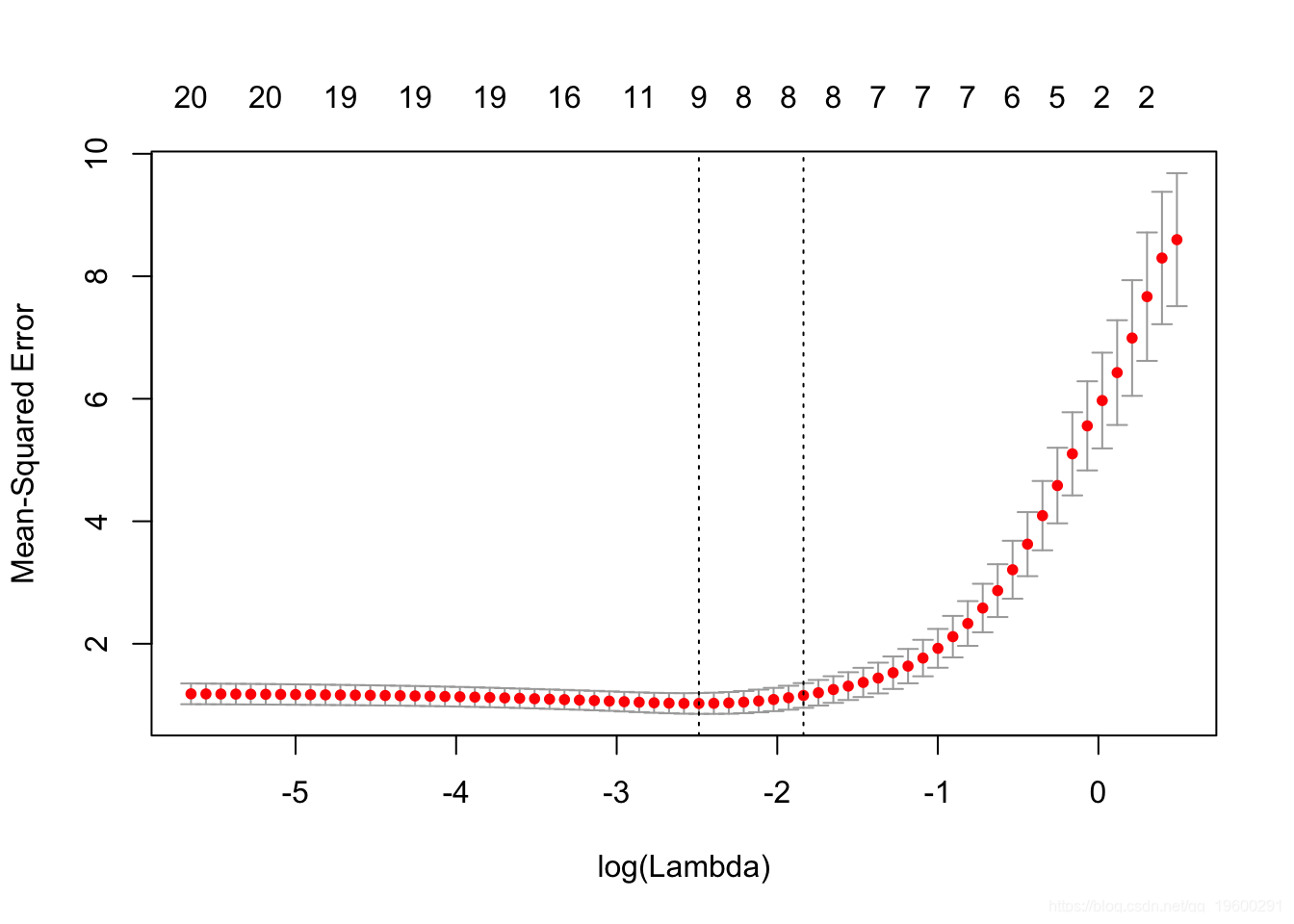 如前所述,图中的左垂直线向我们显示了CV误差曲线达到最小值的位置。右边的垂直线向我们展示了正则化的模型,其CV误差在最小值的1个标准偏差之内。我们还提取了最优λ。