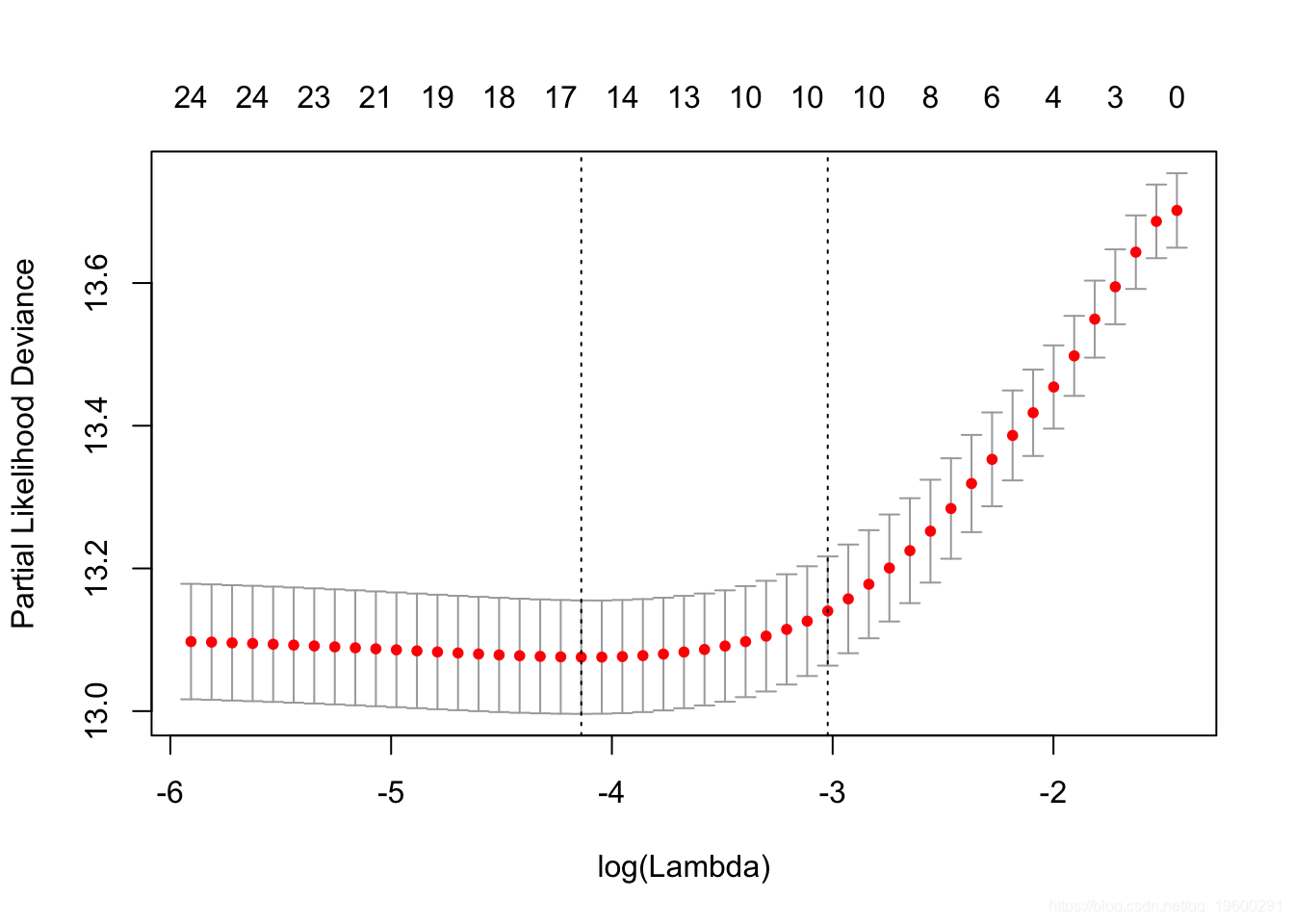 函数 cv.glmnet 可用于计算Cox模型的k折交叉验证。