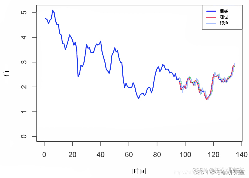 与大多数分析中训练和测试数据集是随机抽样的不同,对于时间序列数据,观察的顺序确实很重要。以下代码将系列的 前 70% 作为训练集,其余 30% 作为测试集。