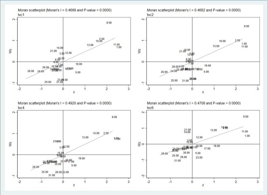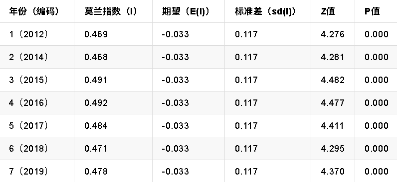 4. 各年份全局莫兰指数均显著为正,进一步验证空间正相关性的稳定性:
