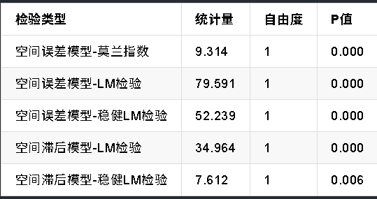 2. LM检验:用于判断是否存在空间效应,结果如下表所示,空间误差模型与空间滞后模型的检验统计量均显著拒绝原假设,说明数据存在显著空间效应,需构建空间面板模型。