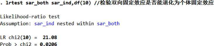 2. 效应类型选择:通过LR检验对比个体、时点与双向固定效应,结果显示双向固定效应无法退化为个体或时点固定效应(P值分别为0.0206、0.000),最终确定构建双向固定效应SAR模型。